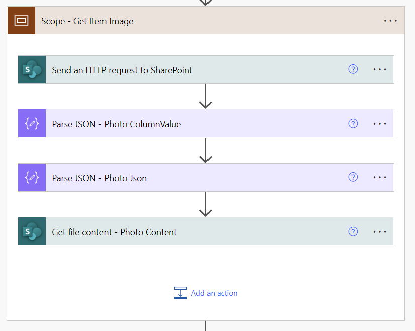 The route to solve this scenario is to utilize the content we have from the list item and then add additional connectors and actions to pull the image from SharePoint itself via its API. As we have the list item content from the default SharePoint Connector, we can use its data to get the Image metadata by first parsing the SharePoint Column and then the Value to get it into a typed content format. Last step is to use the typed content to pull the image directly. This is achieved through a 4-step process as the Scope below illustrates.