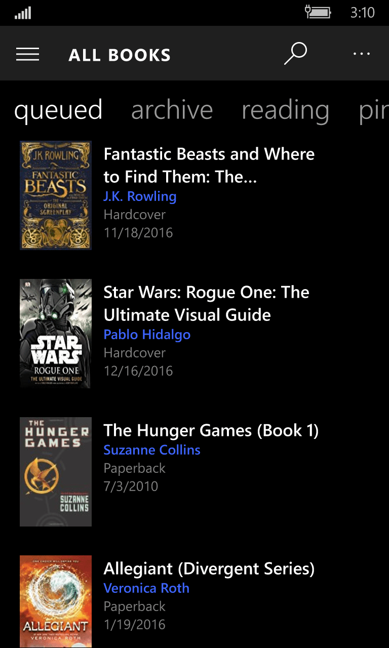 I love the app… both on the phone and my Surface 2. However, the ability to change a book from the que to reading to archive doesn’t work anymore on my Surface.